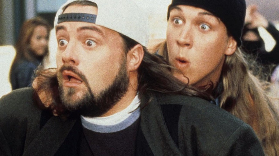 Following the triumph of Clerks, Smith secured a deal with a major Hollywood studio (Universal Pictures!) to make his own take on the sex comedies of the ‘80s; as producer James Jacks liked to say, they were aiming to make “a smart Porky’s.” Like Clerks, this movie is about two buddies – Jason Lee as the comic book-loving Brodie Bruce, Jeremy London as his mopey pal T.S. Quint – spending the day hanging out, this time at a mall instead of in a convenience store, and dealing with romantic issues while Jay and Silent Bob do their thing on the side. Unlike Clerks, Mallrats was a financial failure and took a beating from critics. The sophomore slump. But since this was a bigger budgeted studio movie (in color!) and more widely accessible than its predecessor, with a goofier sense of humor and slightly less vulgar dialogue, it ended up reaching a large audience over the years. For many fans, Mallrats is the movie that introduced them to Kevin Smith. Elements of the story also reveal that this film takes place firmly in the same world as Clerks – and while we’re used to this type of synergy now, at the time it was almost unheard of to see films take place in the same cinematic world if they weren’t direct sequels. The View Asknewiverse was established – fittingly, with a movie that features Marvel legend Stan Lee.