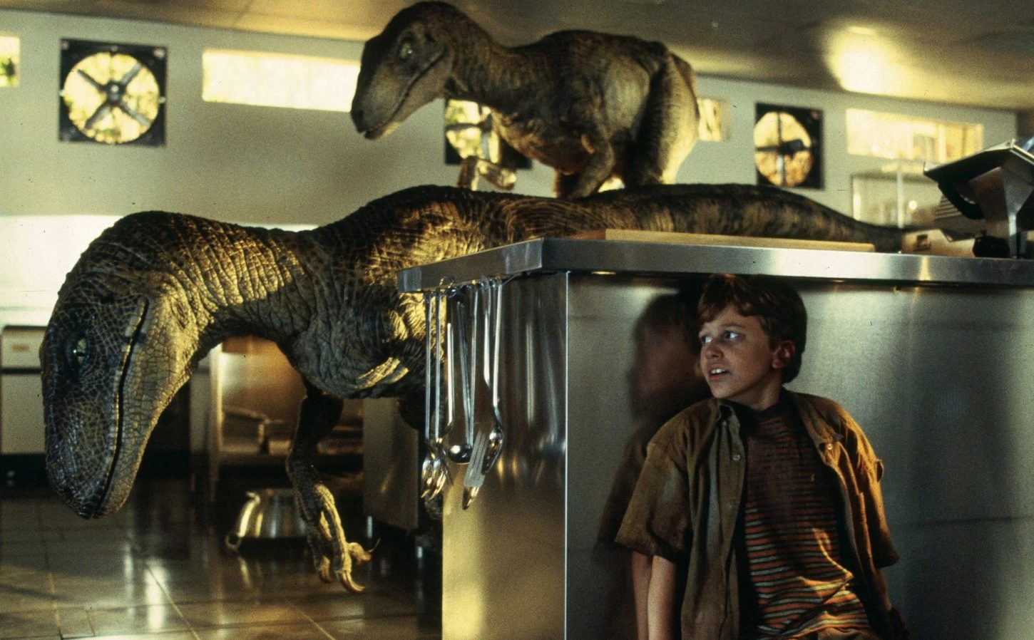 The Stranger Things season 5 trailer features a demodog in a kitchen while Lucas and Max hide in terror, harkening back to the Jurassic Park kitchen scene.