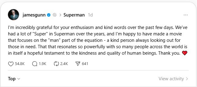 James Gunn expresses gratitude for Superman’s warm reception by promoting kindness above division in a heartfelt message to fans